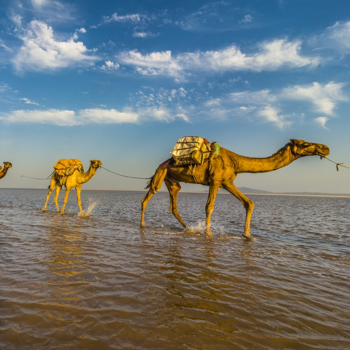 The Danakil Depression marks the northern end of the Great Rift Valley on the African mainland, the point where Earth’s forces are most actively tearing the continent apart. It is an extremely arid, hot desert area which stretches from the coastline of Eritrea through north-eastern Ethiopia and western parts of Djibouti. The Danakil is an area of outstanding geological interest, providing a unique window on the underlying processes which have created the Earth’s continents and land masses. Here, in relatively close proximity, geological features associated with the splitting of continental land masses are clearly seen, including intense volcanic activity (with one of the few permanent lava lakes on the planet on Mount Erta Ale), hot sulphur springs elaborately decorated with extraordinary coral-like formations as well as salt-encrusted lake beds. An expedition to the Danakil Depression will always be a unique adventure!!